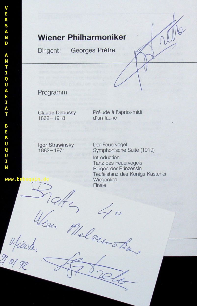 PRETRE, Georges (Dirigent): eigenhändig signierte und datierte Autogrammkarte + ebensolches Programmheft. Mit den Wiener Philharmonikern. Hier als Ersatzbesetzung für den erkrankten James Levine mit dessen Programmheft. München (Philharmonie), 21.1.1992. 8 x 12,5 cm. Karteikarten in Programmheft. Darin auf Beilage ebenfalls signiert. 20 S. mit zahlr. Abb. OKart. = Hölrtnagel. Georges Prêtre (* 14. August 1924 in Waziers bei Douai, Frankreich; † 4. Januar 2017 in Navès, Département Tarn, Frankreich) war ein französischer Dirigent. Er war Generalmusikdirektor der Pariser Oper und seit 1956 in der Opéra-Comique in Paris. 1966 dirigierte er die letzte Aufführung in der alten New Yorker Metropolitan Opera und wenig später ebenso die Eröffnung des Neubaus. Von 1986 bis 1991 war er „Erster Gastdirigent“ der Wiener Symphoniker. Er leitete regelmäßig die großen Orchester Europas und Amerikas, darunter die Berliner Philharmoniker (Waldbühnen-Konzert 1992) und die Wiener Philharmoniker.