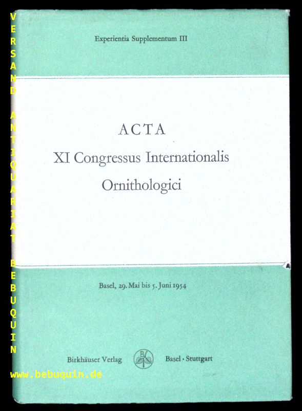 ORNITHOLOGIE.– PORTMANN, Adolf + SUTTER, Ernst: Acta XI. Congressus internationalis ornithologici. Im Auftr. d. Präsid. Sir Landsborough Thomson hrsg. Basel (Birkhäuser), 1955. Gr. 8°. 680 S. mit zahlr. Abb. + Bildtafeln. OLn mit OUmschl. gutes Ex. = Experentia. Suppl, 3. EA.