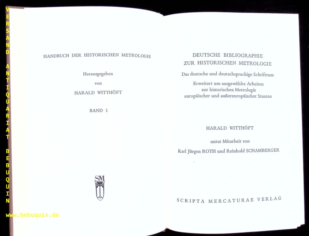 WITTHÖFT, Harald: Deutsche Bibliographie zur historischen Metrologie. Das deutsche und deutschsprachige Schrifttum. Erweitert um ausgewählte Arbeiten zur historischen Metrologie europäischer und aussereuropäischer Staaten. St. Katharinen (Scripta-Mercurae), 1991. Gr. 8°. XXVIII, 431 S. OLn mit Goldprägung. tadellos. = Handbuch der historischen Metrologie, Bd. 1. EA.