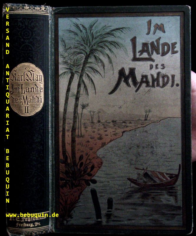 MAY, Karl: Im Lande des Mahdi. II. Band. Reiseerlebnisse. 21.– 25. Tsd. Freiburg (Fehsenfeld), (1901). 587 (1) S. farb. ill. OLn. (DB 68). Kanten etwas berieben, Rückenkante angeplatzt, sonst gutes Ex. mit strahlendem Rückengold. = Gesammelte Reiseerlebnisse, Bd. XVII. Plaul 279.5.