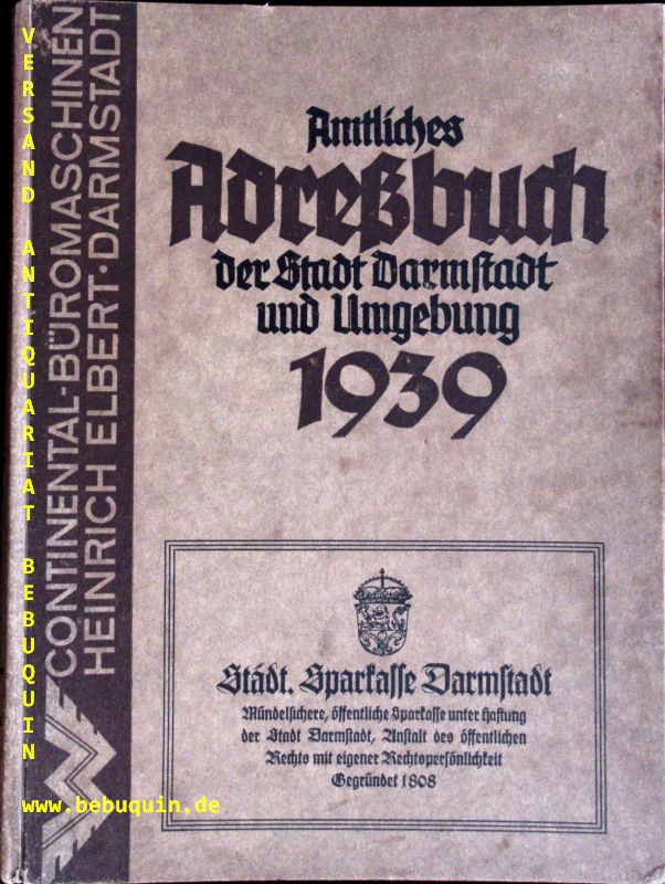 DARMSTADT.– AMTLICHES ADRESSBUCH DER STADT DARMSTADT UND UMGEBUNG 1939.– Mit den Einwohnerverzeichnissen von Darmstadt-Arheiligen, – Eberstadt, Griesheim, Jugenheim, Nieder-Ramstadt, Ober-Ramstadt, Pfungstadt, Roßdorf, Seeheim und Traisa. Darmstadt (Roether), 1938. Gr. 4°. 6 Bl., 100, 578, 78 S. mit zahlr. Abb. ill. OPb. leicht gebräunt, insgesamt gutes Ex. Seltenes Adressbuch mit der Sortierung nach Einwohner, Straßen, Branchen und Behörden.