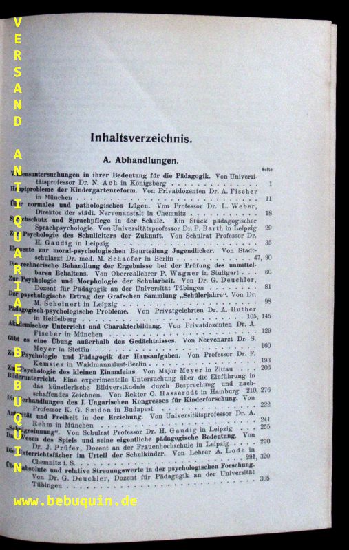 PSYCHOLOGIE.– MEUMANN + SCHEIBNER: Zeitschrift für Pädagogische Psychologie und experimentelle Pädagogik. XVI. Jahrgang. Leipzig (Wuelle & Meyer), 1913. Gr. 8°. VIII, 656 S. mit zahlr. Abb. und Bildtafeln. HLdr der Zeit in Schlangenhautoptik mit goldgeprägtem Rücken. gutes Ex. seltenes Ex.