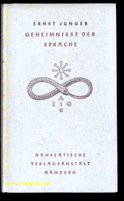 JÜNGER, Ernst: Geheimnisse der Sprache. 2 Essays. Hamburg (Hanseat. Verl. Anst.), (1939). 78 (5) S. ill. OPb. kaum gebräunt mit einer monogrammierten und datierten Widmung in extrem kleiner mikrogrammartiger Handschrift auf Titelseite. EA WG² 40.