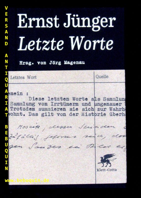 JÜNGER, Ernst: Letzte Worte. Stuttgart (Klett-Cotta), 2013. kl. 8°. 245 S.mit zahlr. Abb. OLn mit Bauchbinde. tadellos. EA.