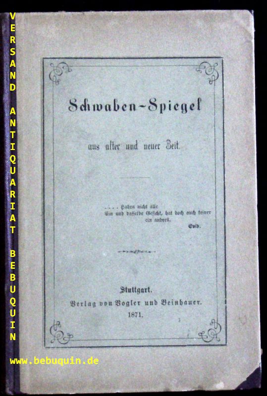 SCHWABEN.– (HARTMANN, Julius:) Schwaben-Spiegel aus alter und neuer Zeit. Stuttgart (Vogler u. Beinhaner), 1870. kl. 8°. 184 S. OHLn. gutes Ex. SCHWABEN.–