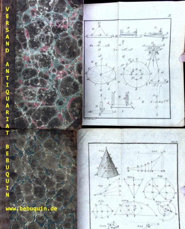 JAGD.– HOSSFELD, Johann Wilhelm: Praktische Geometrie. 2 Bände welche die Forstgeometrie, Theilung der Figuren und das Nivellieren enthalten. Sowie die geographische Messung, Stereometrie, höhere Geometrie und Momentenlehre. 2 Bände. Gotha/Erfurt, Hennings, 1821. XIV, 538, 472 (2) S. + 46 gefaltete Bildtafeln mit dreiseitigem Rotschnitt. HLdr der Zeit mit goldgeprägtem Rücken. Rücken etwas gebräunt, eine Ecke stärker gestaucht. = Die Forst- und Jagdwissenschaft nach allen ihren Theilen für angehende und ausübende Forstmänner und Jäger, 6. Theil. EA. Johann Wilhelm Hoßfeld oder Hossfeld (* 19. August 1768 in Oepfershausen; † 23. Mai 1837 in Dreißigacker) war ein deutscher Forstmathematiker. Er war ein Pionier der Mathematik im Bereich der Forstwissenschaft. (Wikipedia)