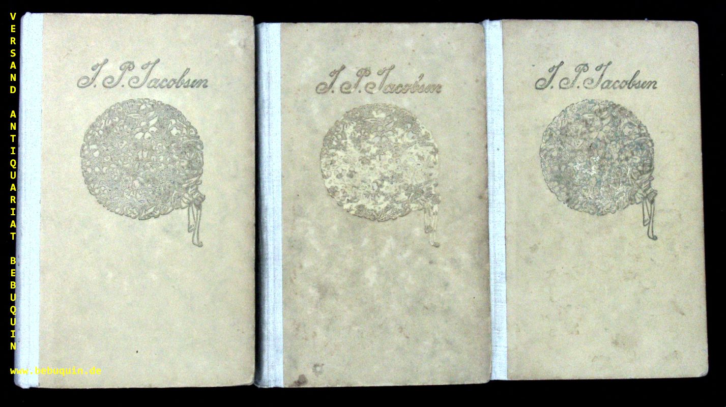 VOGELER.– JACOBSEN, J.P.: Gesammelte Werke. D.v. Marie Herzfeld. 18.– 20. Tsd. 3 Bände. Jena (Diederichs), 1919. XLVIII, 431, 347, 302 S. mit zahlr. Illustrationen von Heinrich Vogeler-Worpswede. OHLn. mit goldgeprägter Deckel- und Rückenillustration von Heinrich Vogeler-Worpswede. Einbände etwas angeschmutzt, Bd. II mit abgeblätterter Goldprägung.