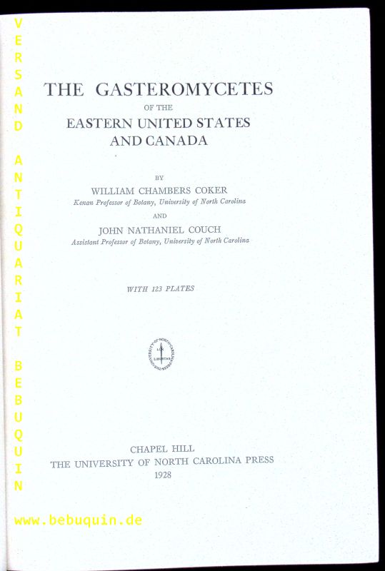 PILZE.– COKER, William Chambers + COUCH, John nathaniel:: The Gasteromycetes of the Eastern United States and Canada. Chapel Hill (Univ. of North Carolina), 1928. 4°. IX, 201 S. + 123 Tafeln. OLn mit Goldprägung. Einband mit Lichtrand, kaum gelockert, gutes Ex. EA.