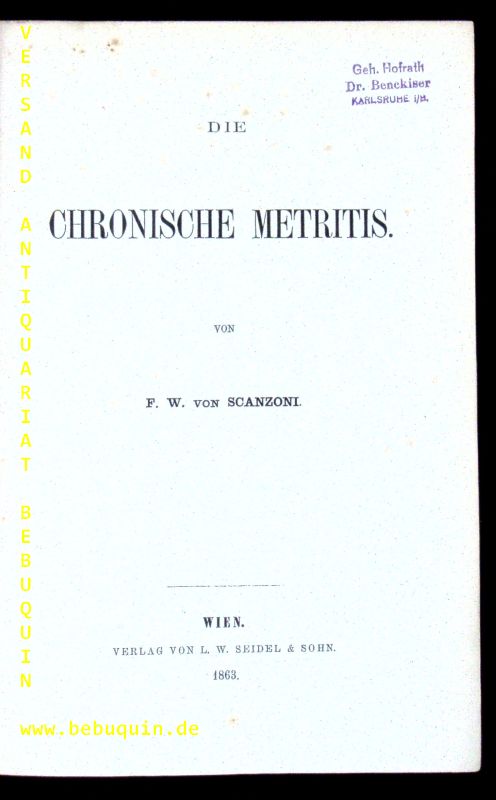 MEDIZIN.– SCANZONI, F. W. von: Die chronische Metritis. Wien (Seidel & Sohn), 1863. VIII, 334 (1) S. HLdr der Zeit mit goldgeprägtem Rücken. Kanten berieben, Rücken etwas angeplatzt, Papier aauf den letzten Seiten gebräunt. EA. Hirsch/H. V, 43: „ (Scanzoni) hat die Untersuchungsmethoden in der Gynäkologie wesentlich ausgebaut, die operative Technik durch Einzelheiten bereichert und zur Begründung der Gynäkologie auf patholog. Anatomie nach Kräften beigetragen.“ – Vgl. Fasben. 304.