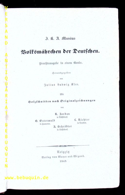 MUSÄUS, Johann Karl August: Volksmährchen der Deutschen. Hrsg. von Julius Ludwig Klee. Prachtausg. in 1 Bde. Leipzig (Mayer & Wigand), 1842. 4°. 752 S zahlr. Holzschnitten von Jordan, Osterwald, Richter und Schrödter. OHLdr mit goldgeprägtem Rücken. Einband etwas berieben, innen teils fingerspurig, insgesamt gutes Ex. 1. Aufl. dieser Ausgabe