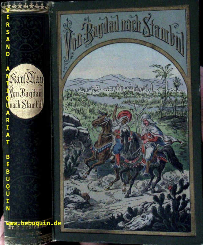 MAY, Karl: Von Bagdad nach Stambul. Reiseerzählung. 46.– 50. Tsd. Freiburg (Fehsenfeld), (1907). 644 S. mit einem Portrait des Verfassers. farb. ill. OLn. Plaul 41. Rücken am Fuß gering geblichen, Vortitel knitterspurig, Schnitt leicht berieben, insgesamt schönes Ex. mit farbstarkem Deckel und goldglänzehdem Rücken. = Gesammelte Reiseerzählungen, Bd. 3. Diese Ausgabe von großer Seltenheit Plaul 230.11.