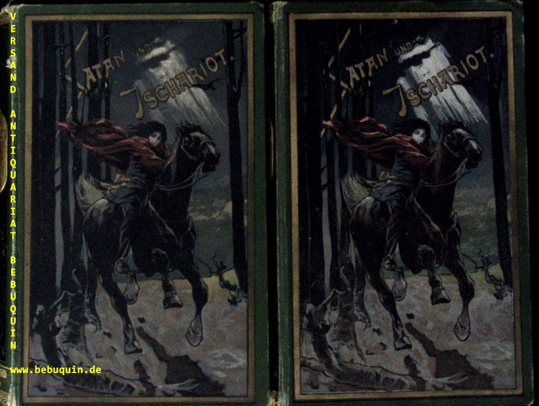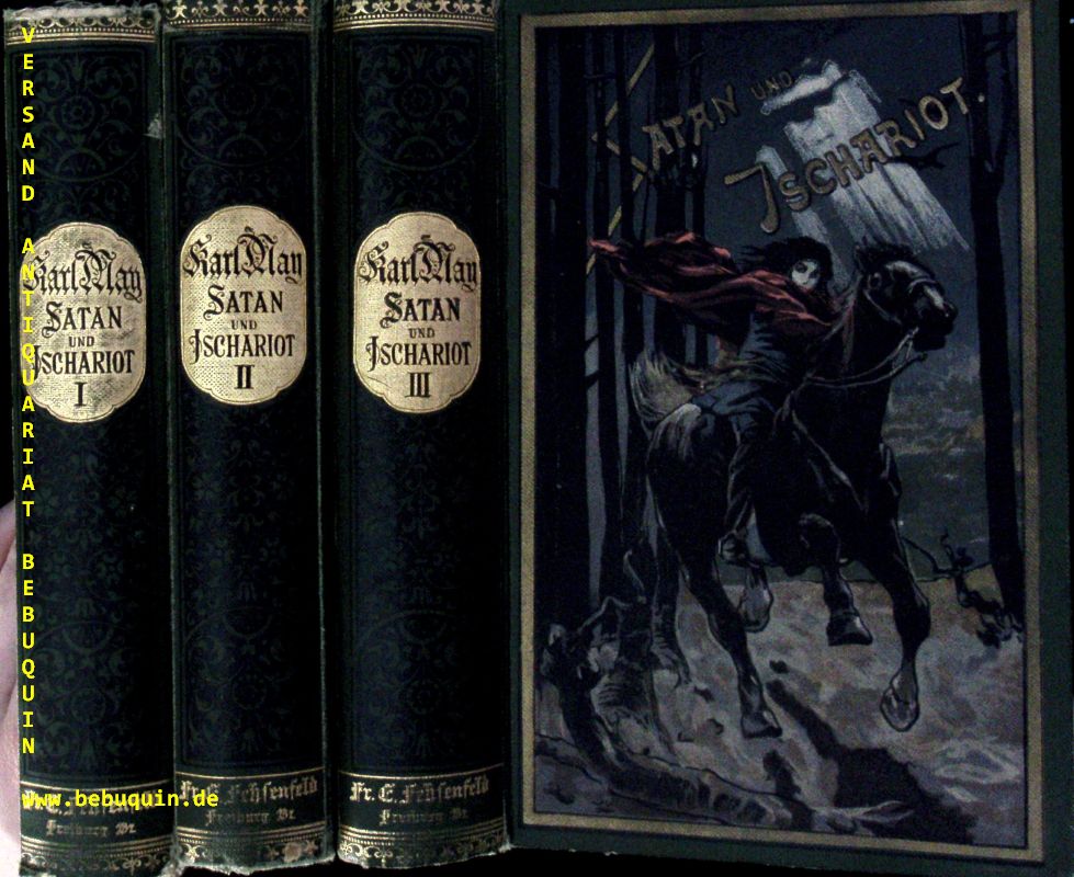 MAY, Karl: Satan und Ischariot. Reiseerlebnisse. 26.– 30.; 21.– 25.; 21.– 25. Tsd. 3 Bände. Freiburg (Fehsenfeld), 1905 / 1901. 550 (1), 540, 615 (1) S. ill. OLn. (DB 72). Kanten etwas berieben, vorderes Gelenk von Bd 2 gelockert, Vorsätze mit handgeschriebener Bandnummer und 2 Bände mit kleiner Titelergäntzung auf Reihentitel, sonst gut mit farbstarken Einbänden und goldglänzenden Rücken. = Gesammelte Reiseerzählungen, Bd. XX – XXII. Plaul 287.5 + 291.4 + 292.54.