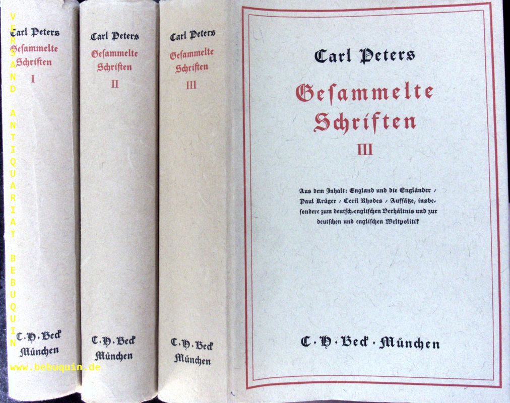 AFRIKA.– PETERS, Carl: Gesammelte Schriften. 3 Bände. München (Beck), 1943 – 1944. Gr. 8°. X, 516; VI, 558; VII, 530 S. mit 11 Bildtaf. u. 3 Faltkarten. OHLn mit OUmschl. gutes Ex. EA.