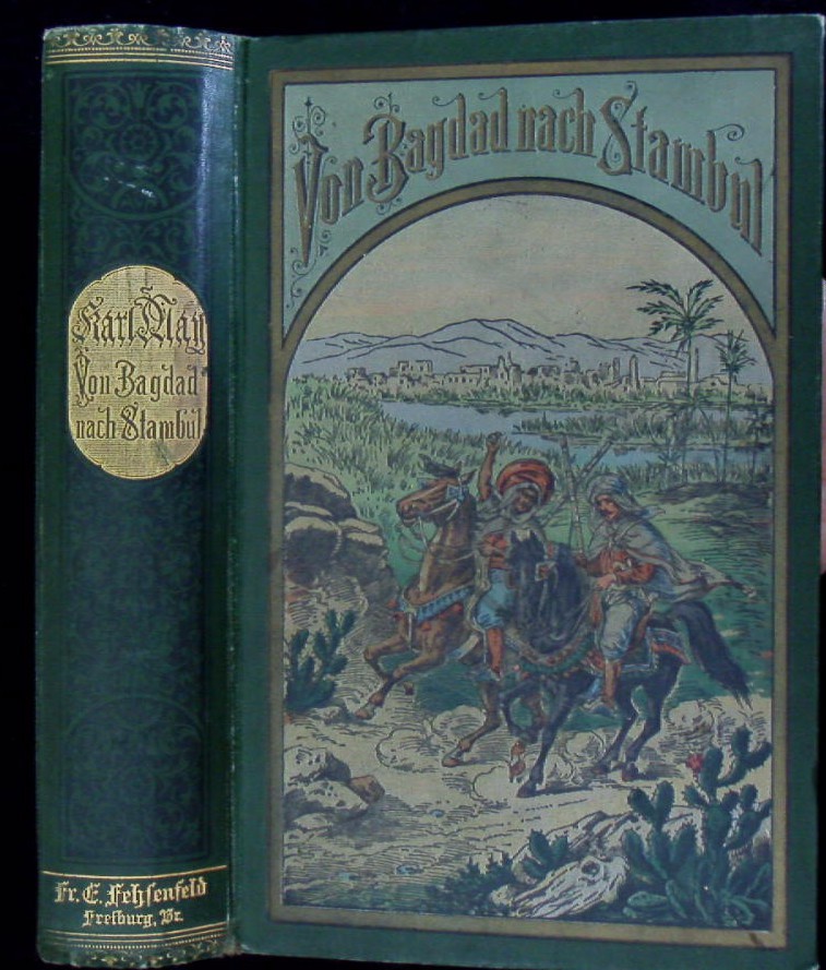 MAY, Karl: Von Bagdad nach Stambul. Reiseerlebnisse. 21.– 25. Tsd. Freiburg (Fehsenfeld), (1897). 644 S. mit einem Portrait des Verfassers. farb. ill. OLn. (DB 41). kaum schief gelesen, NaT, sonst gutes Ex. mit schönem Rückengold. = Gesammelte Reiseerzählungen, Bd. III. 1. Auflage mit dem neuen Reihentitel. Plaul 230.6.