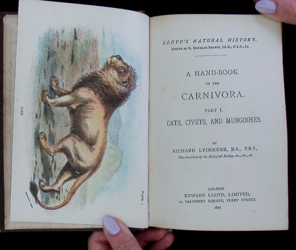 ZOOLOGIE.– LYDEKKER, Richard: A Hand-Book to the Carnivora. Part 1. Cats, Civets and Mungooses. London (Lloyd). 1896. 312 S. + 32 farb. Bildtafeln. OHLdr. Rücken stärher geblichen und berieben, sonst feines Erhaltung. = Lloyds Natural History. Ed. by R. Bowler Sharpe. EA.