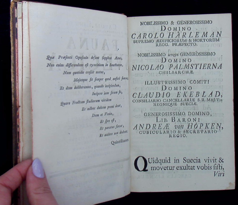 ZOOLOGIE.– LINNE, Carl von: Fauna Svecica. Sistens Animalia Sveciæ Regni: Qvadrupedia, Aves, Amphibia, Pisces, Insecta, Vermes ; Distributa Per Classes & Ordines, Genera & Species ; Cum Differentiis Specierum, Synonymis Autorum, Nominibus Incolarum, Locis Habitationum, Descriptionibus Insectorum. Leyden, 1746. 8°. 15 Bl., 411 S. mit gestochenem Frontisp. (Kupferst.) und 1 (von 2) gestochenen Kupfertafeln. Ldr der Zeit mit reicher Rückenvergoldung. Kanten leicht berieben, Vorsätze teils lädiert, eine Seite mit Einriss, es fehlt die erste von 2 Falttafeln, sonst von guter Erhaltung. Zweiter Druck der EA des Grundlagenwerks des schwedischen Naturforschers. Huth 48; Horn / Sch. 13563; DSB VIII 376.