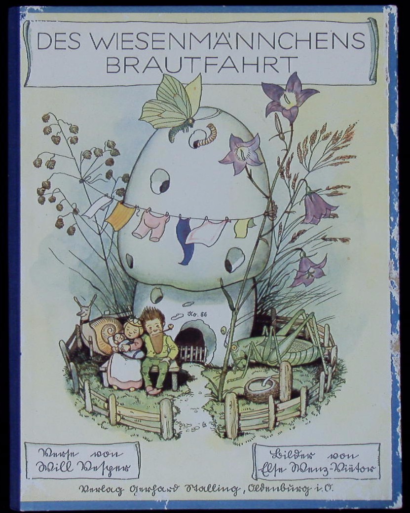 WENZ-VIETOR. VESPER, Will: Des Wiesenmännchens Brautfahrt. Oldenburg (Stalling), 1932. 4°. 8 Bl. mit 3 farb. Vollbildern und 15 farb. Textbildern von Else Wenz-Vietor. farb. ill. OHLn. Kanten leicht berieben, sonst schönes Ex. = Stalling Bilderbuch, Nr. 86. Wenz Vietor 68, Schiefertafel VII,2.