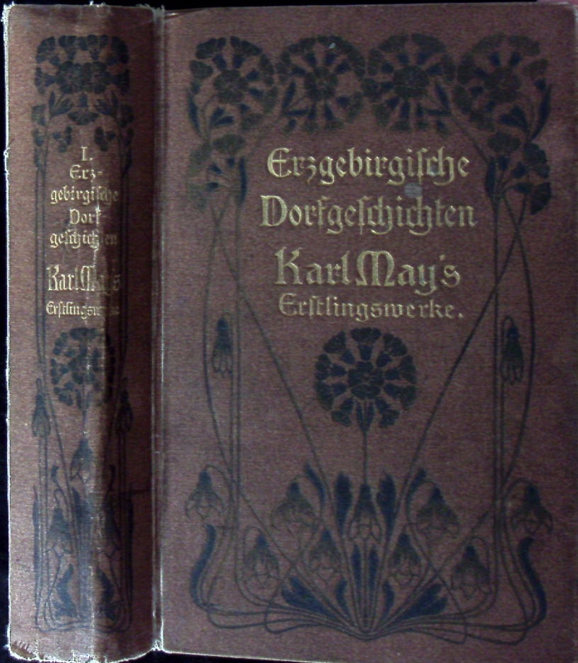 MAY, Karl: Erzgebirgische Dorfgeschichten. Karl Mays Erstlingswerke. Autorisierte Ausgabe. Bd. 1. (ein zweiter Band ist nie erschienen.) Dresden (Belletristischer Verlag), (1903). 3 Bl., 648 S. mit 12 Vignetten. rotbrauner ill. OLn mit floraler Deckel- und Rückenverzierung sowie goldgeprägter Deckel- und Rückenbeschriftung und illustrierten Vorsätzen. (DB 117). Kanten etwas berieben, Rücken mit mittiger Faltspur, Gelenke etwas gelockert, insgesamt gutes Ex. EA dieses seltenen Sammelbandes. Plaul 372.1.