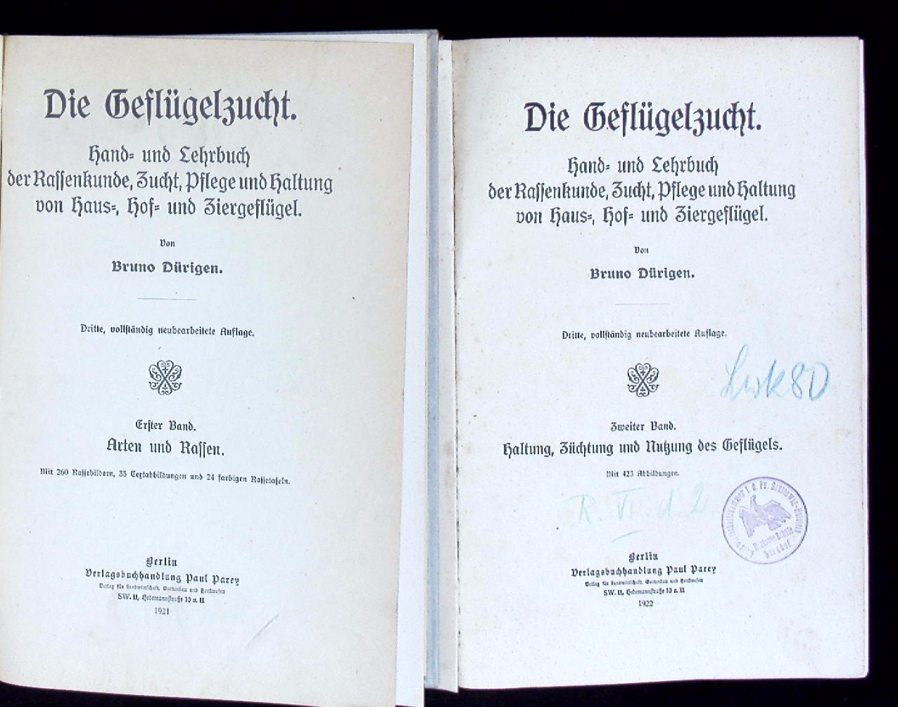 ORNITHOLOGIE.– DÜRIGEN, Bruno: Die Geflügelzucht. Hand- und Lehrbuch der Rassenkunde, Zucht, Pflege und Haltung von Haus-, Hof- und Ziergeflügel. 1. Band: Arten und Rassen. 2. Band: Haltung, Züchtung und Nutzung des Geflügels. 3., vollst. neubearb. Aufl. 2 Bände Berlin (Parey), 1921/22. Gr. 8°. XI, 555 S. mit 260 Rassebildern und 35 Textabb. sowie VII, 552 S. mit 423 Abb. späteres HLn. bzw. ill. OLn. die farb. Bildtafeln fehlen in diesem Ex., unterschiedliche Einbände, als Arbeitsex. brauchbar. Eduard Bruno Dürigen (* 1. Februar 1853 in Erdmannsdorf, Sachsen; † 12. Februar 1930 in Berlin) war ein deutscher Zoologe und Geflügelkundler. Er lehrte als erster Wissenschaftler in Deutschland Geflügelzuchtwesen. (Wikipedia)