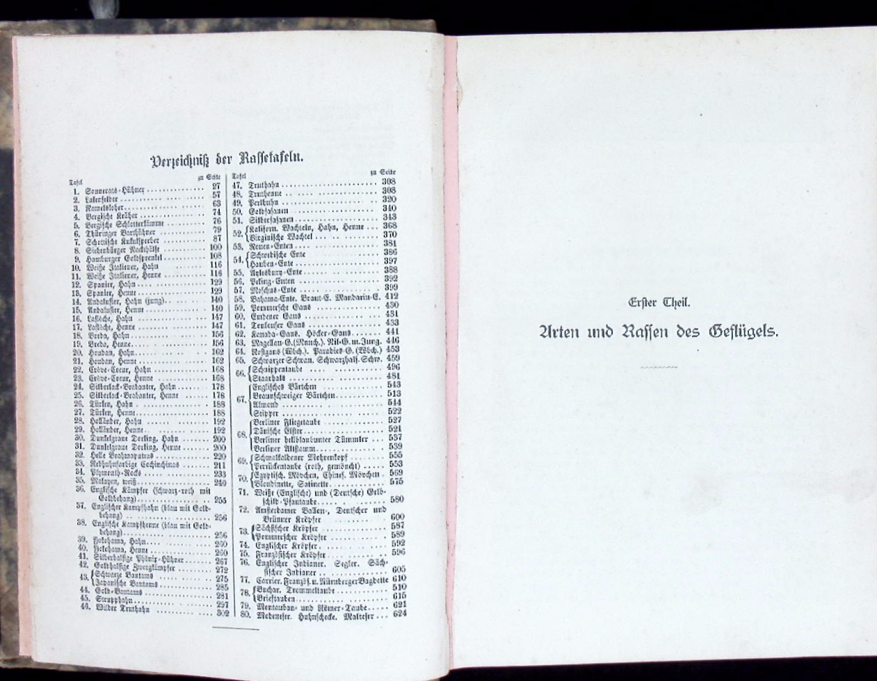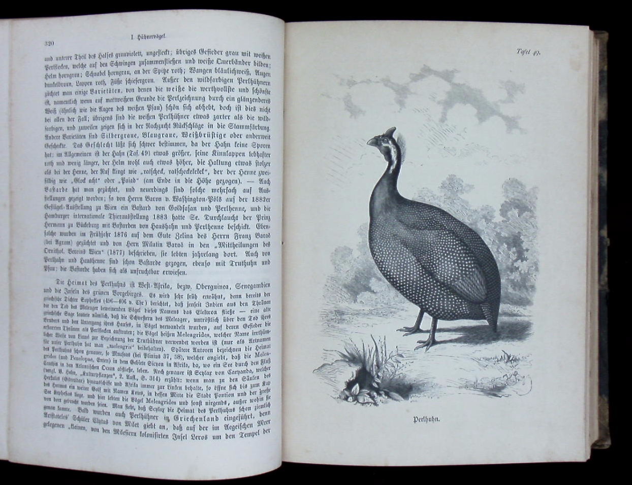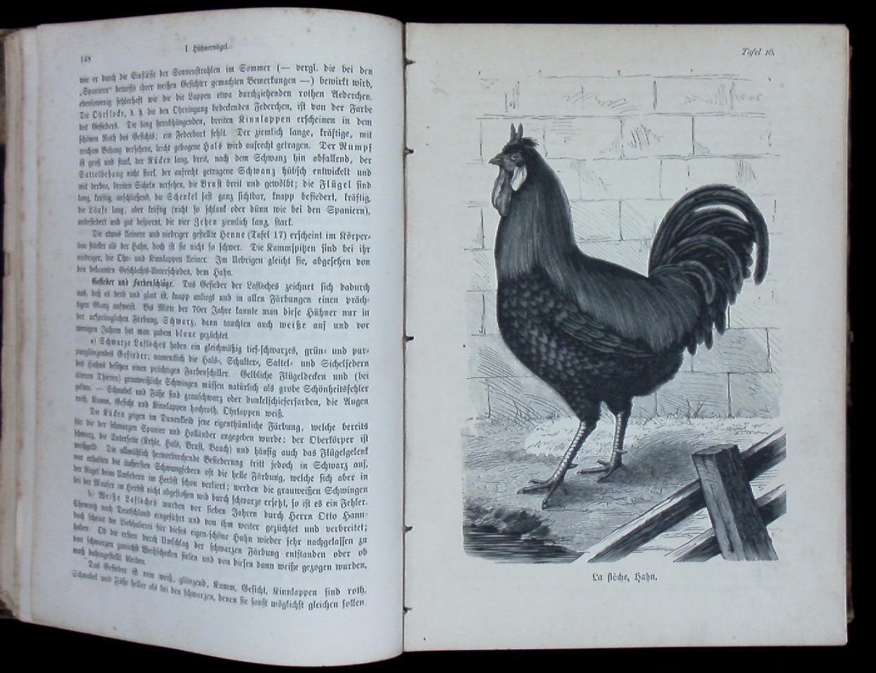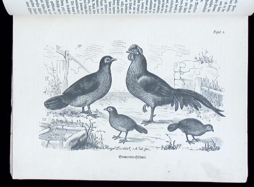 ORNITHOLOGIE.– DÜRIGEN, Bruno: Die Geflügelzucht nach ihrem jetzigen rationellen Standpunkt. Berlin (Parey), 1886. Gr. 8°. S. VI – XIII, 880 S. mit 80 Rassetafeln in Holzschnitt von Hugo Schindler und 101 Textholzstichen. späteres HLn. Titelei fehlt, wenige Seiten mit geringen Randschäden, insgesamt noch gut erhalten. seltene EA des wichtigen Standardwerks mit den eindrucksvollen Tafeln.