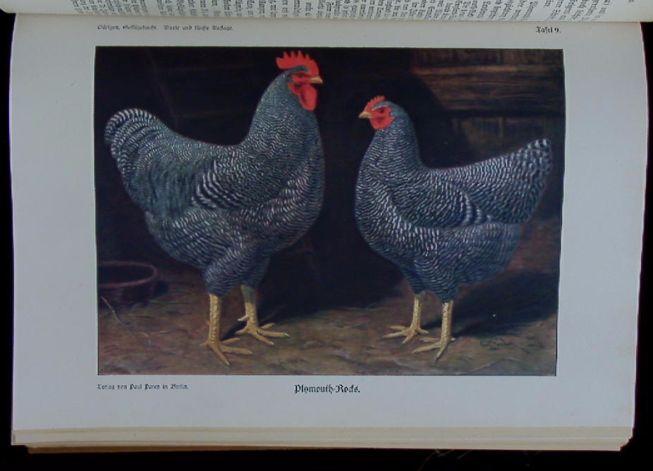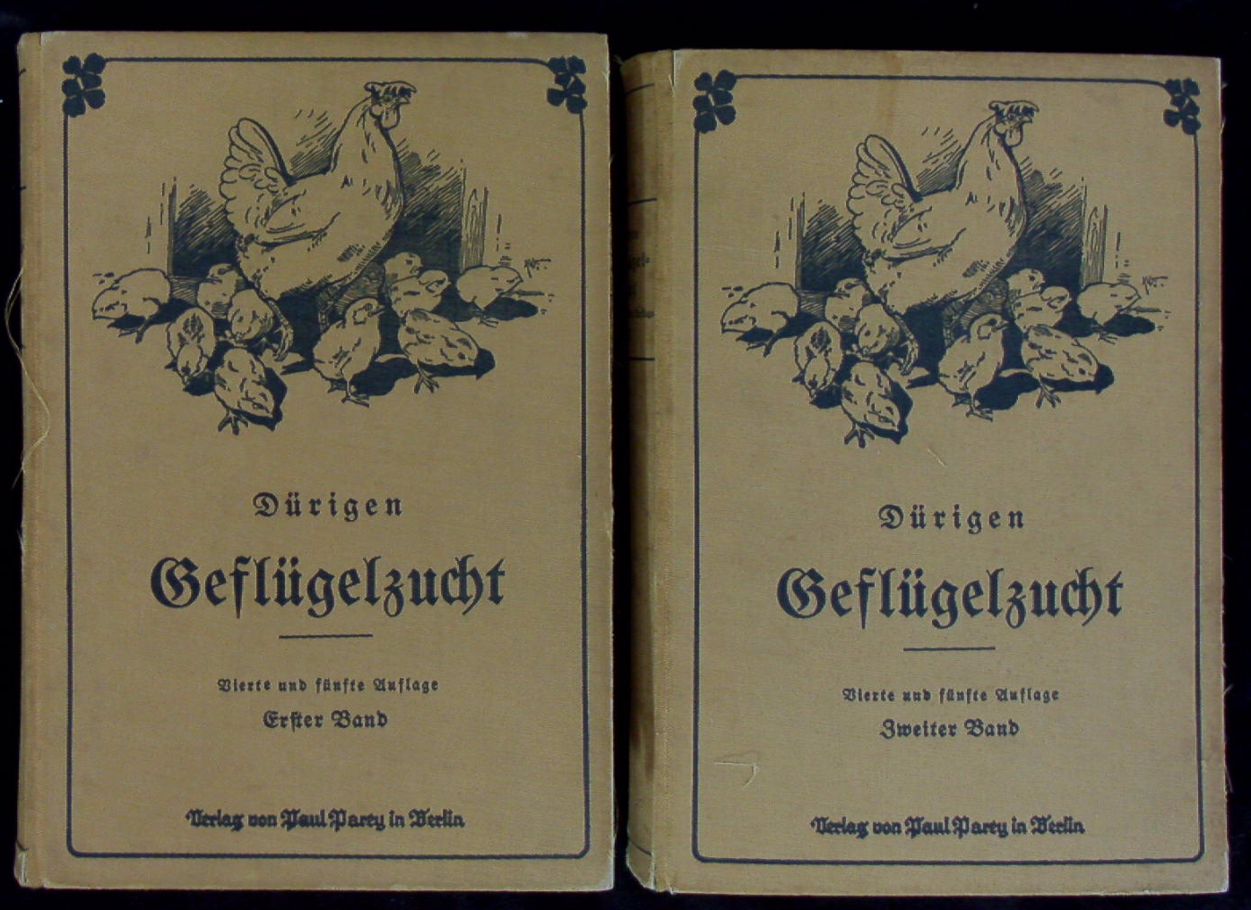 ORNITHOLOGIE.– DÜRIGEN, Bruno: Die Geflügelzucht. Hand- und Lehrbuch der Rassenkunde, Zucht, Pflege und Haltung von Haus-, Hof- und Ziergeflügel. 1. Band: Arten und Rassen. 2. Band: Haltung, Züchtung und Nutzung des Geflügels. 4. und 5. neubearb. Aufl. 2 Bände. Berlin (Parey), 1923/27. Gr. 8°. XVI, 583 S. mit 287 Rassebildern und 38 Textabb. und 24 farb. Rassetafeln sowie VIII, 635 (1) S. mit 445 Abb. ill. OLn. Rücklen von Bd. 1 abgeplatzt, Rücken von Bd. 2 stockig, innen gut. Eduard Bruno Dürigen (* 1. Februar 1853 in Erdmannsdorf, Sachsen; † 12. Februar 1930 in Berlin) war ein deutscher Zoologe und Geflügelkundler. Er lehrte als erster Wissenschaftler in Deutschland Geflügelzuchtwesen. (Wikipedia)