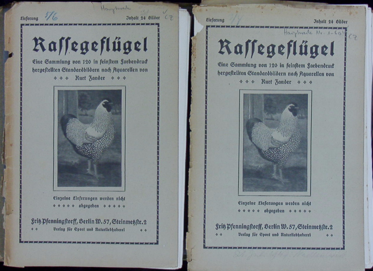 ORNITHOLOGIE.– ZANDER, Kurt: Rassegeflügel. Eine Sammlung von Standardbildern nach Aquarellen. Berlin (Pfenningstorff). (1910). Gr. 8°. 167 farb. Bilder lose in 3 Lieferungsumschlägen (so komplett). farb. ill. OHLn Mappe. Mappe an den Kanten berieben, die Lieferungsumschläge teils nur fragmentarisch erhalten, die Bilder selbst nur sehr vereinzelt leicht gebräunt. EA Nissen I, 442.