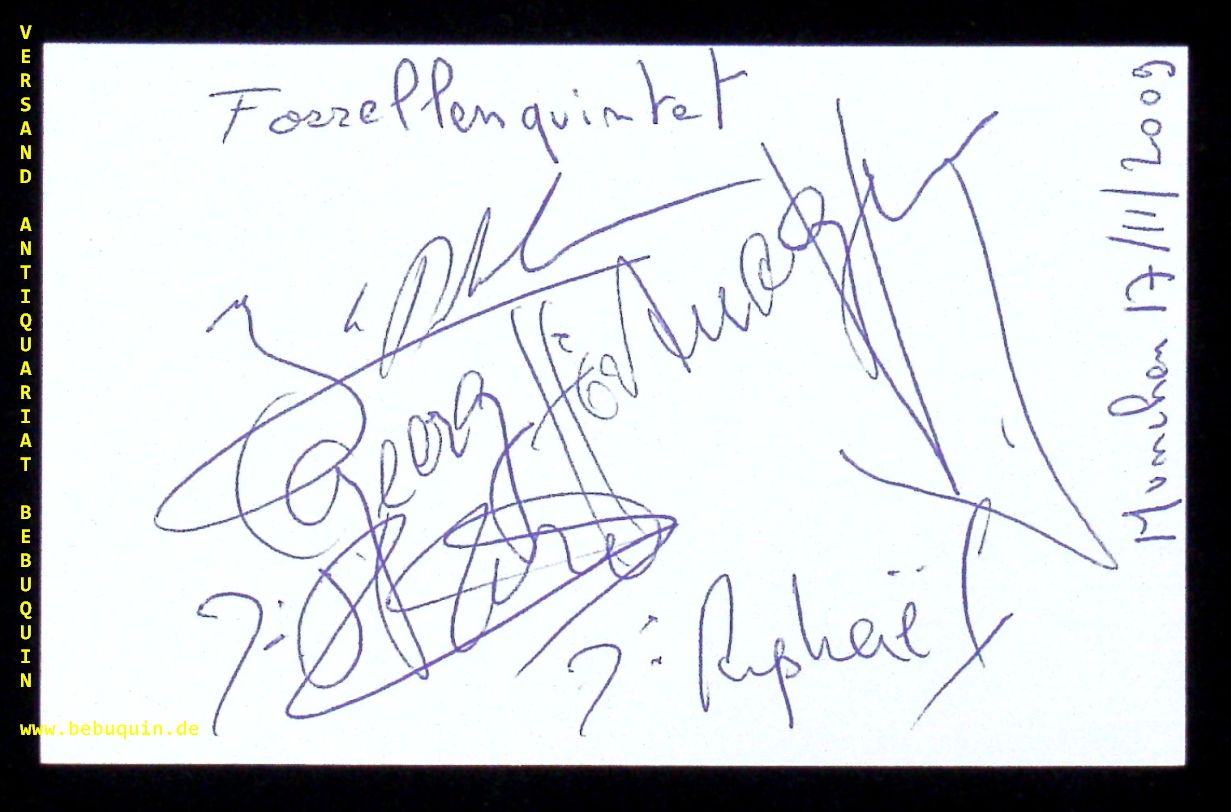 TRIO WANDERER.– HÖRTNAGEL, Georg + GAUGNE, Christophe + COQ, Vincent + PHILIPS-VARJABEDIAN, Jean-Marc + PIDOUX, Raphaël: eigenhändig von allen signierte und datierte Autogrammkarte. München (Herkulessaal), 27.11.2009. 8 x 12,5 cm. Karteikarte. The Trio Wanderer is a French piano trio made up of Vincent Coq, piano, Jean-Marc Phillips-Varjabédian, violin and Raphaël Pidoux, cello, who graduated from the Conservatoire de Paris. In 1988 they won the ARD International Music Competition in Munich, and in 1990 the Fischoff National Chamber Music Competition in the US. (Wikipedia)