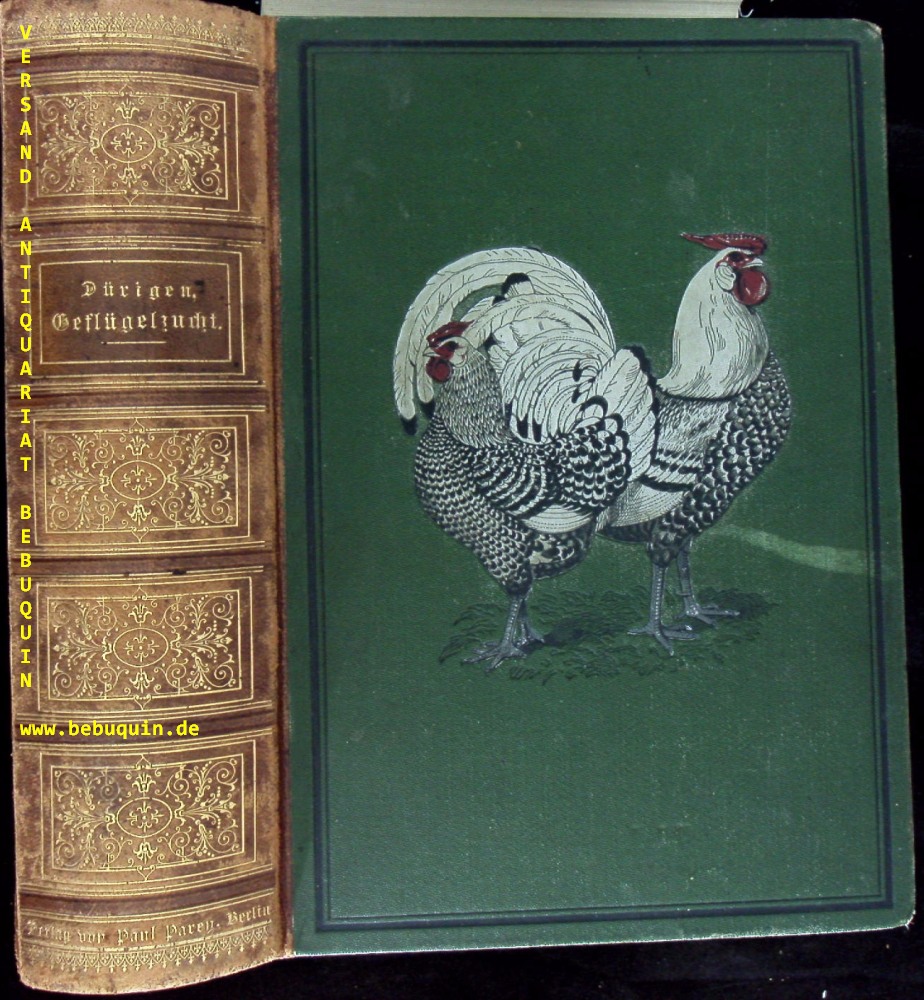ORNITHOLOGIE.– DÜRIGEN, Bruno: Die Geflügelzucht nach ihrem jetzigen rationellen Standpunkt. Berlin (Parey), 1886. Gr. 8°. S. VI – XIII, 880 S. mit 80 Rassetafeln in Holzschnitt von Hugo Schindler und 101 Textholzstichen. ill. OHLdr. Kanten leicht berieben, Schnitt und Titelei stockfleckig, sonst hin und wieder fingerspurig, Block etwas gelockert, insgesamt noch gut. seltene EA des wichtigen Standardwerks mit den eindrucksvollen Tafeln.