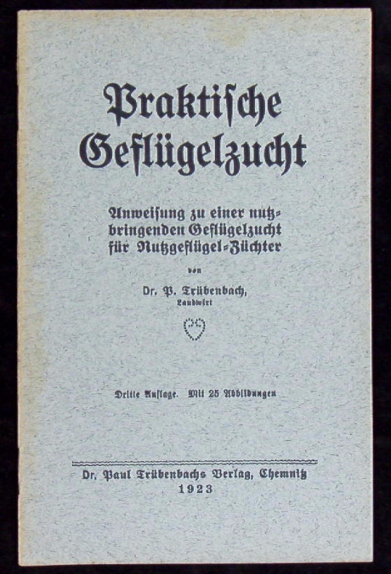 ORNITHOLOGIE.– TRÜBENBACH, Paul: Praktische Geflügelzucht. Anweisung zu einer nutzbringenden Geflügelzucht für Nutzgeflügel-Züchter. 3. Aufl. Chemnitz (Trübenbach), 1923. 38 S. mit 25 Abb. OKart. gutes Ex. Paul Trübenbach (* 3. August 1876 in Chemnitz; † 26. November 1934 in Berlin) war ein deutscher Autor und Verleger von Zeitungen, Büchern, Bildern und Ansichtspostkarten über Nutztiere, Ziergeflügel und Rassetauben. Weiters war er auch selbst Züchter von Rassehühnern und Rassetauben.