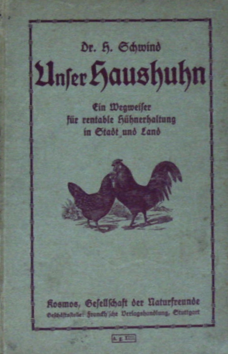 ORNITHOLOGIE.– SCHWIND, H.: Unser Haushuhn. Ein Wegweiser für rentable Hühnerhaltung in Stadt und Land. 6. – 10. Tsd. Stuttgart (Franckh), 1918. 79 S. mit 46 Abb. ill. OPb. WaT, etwas fingerspurig.