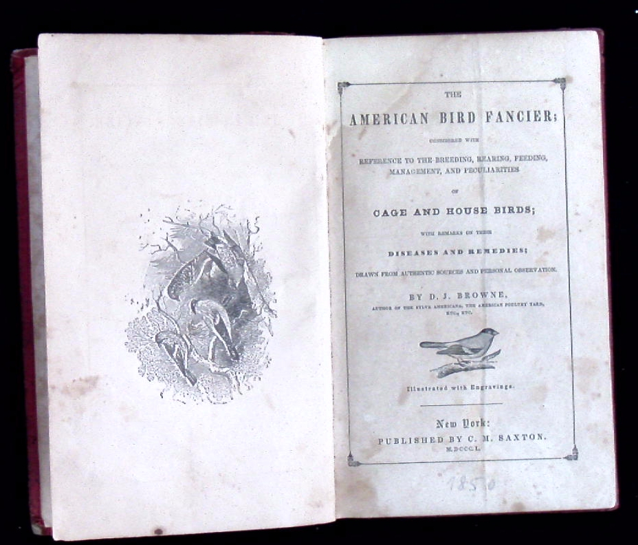ORNITHOLOGIE.– BROWNE, Daniel Jay: The American bird fancier. Reference to the Breedings, Bearing, Feeding, Management and Peculiarities of Cage and House Birds. New York (Saxton), 1850. 107 S., 6 Bl. mit zahlr. Abb. ill. OPb. Rücken fehlt, NaV, innen stärker braunfleckig.