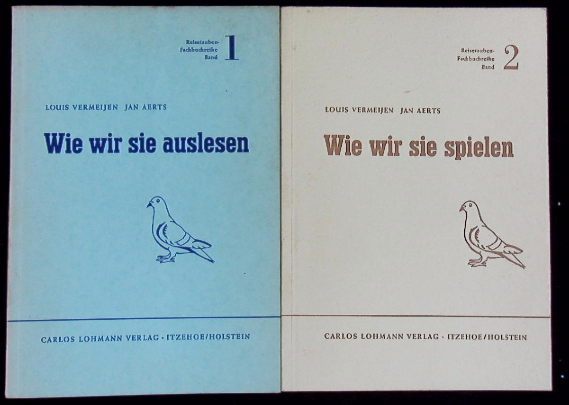TAUBEN.– VERMEIJEN + AERTS: Reisetauben Fachbuichreihe 1 + 2. Wie wir sie auslesen. Wie wir sie spielen. 2 Bände. Itzehoe (Lohmann), 1954. Gr. 8°. 58, 55 S. mit Abb. ill. OKart. tadellos. EA.