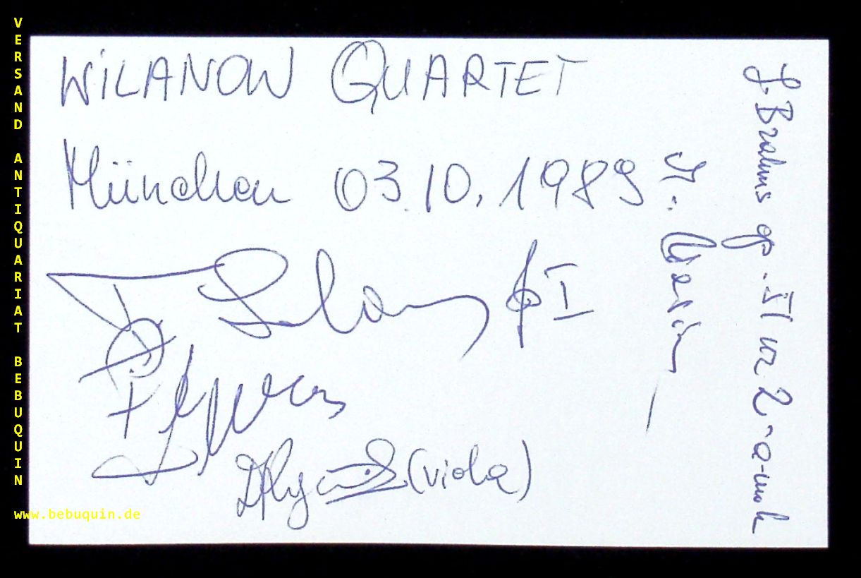 WILANOW QUARTET.– GADZINA, Tadeusz + LOSAKIEWICZ, Pawel + DUZ, Ryszard + WASIOLKA, Marian: eigenhändig von allen signierte und datierte Autogrammkarte. München, 3.10.1989. 8 x 12,5 cm. Karteikarte. Das Wilanow-Quartett ist ein polnisches Streichquartett, das im Jahr 1967 in Warschau gegründet wurde. Dieses Instrumentalquartett besteht aus Tadeusz Gadzina und Pawel Losakiewicz (Violine), Ryszard Duz (Viola) und Marian Wasiólka (Violoncello). Zum Namen: Wilanów (von italienisch: Villanova) ist heute ein südlicher Stadtbezirk von Warschau am westlichen Ufer der Weichsel. (Wikipedia)