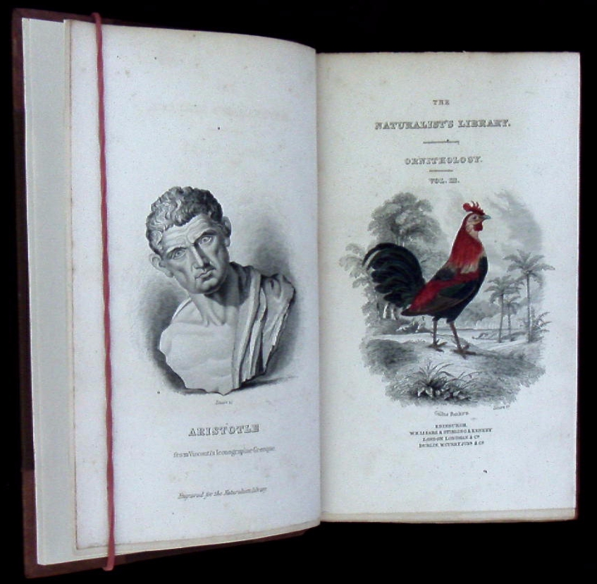 ORNITHOLOGIE.– JARDINE, William: The Natural History Of Gallinaceous Birds. Vol. I. Edinburgh (W. H. Lizars, and Stirling and Kenney), 1834. kl. 8°. Aristoteles Portrait als Frontispiz, kolorierte Titelvignette (Hahn), 232 S. mit zahlr. Textabb.+ 29 kolorierte Bildtafeln mit Vögeln von Andrew Crichton. neues HLdr mit goldgeprägtem Rücken = The Naturalist’s Library, / Vol. III. Sir William Jardine, 7. Baronet (* 23. Februar 1800 in Edinburgh, Schottland; † 21. November 1874 in Sandown, Isle of Wight) war ein schottischer Ornithologe und Herausgeber zoologischer Werke. (Wikipedia)