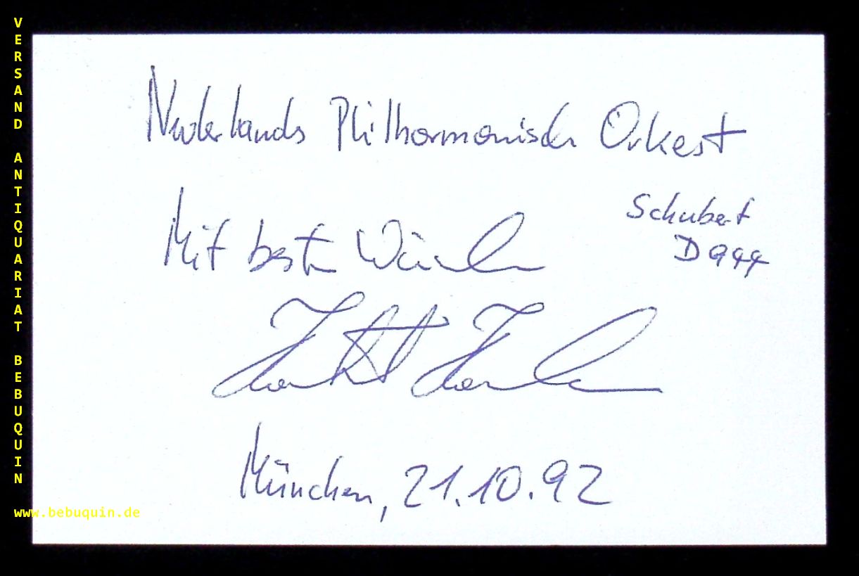 HAENCHEN, Hartmut (Dirigent): eigenhändig signierte und datierte Autogrammkarte: Mit besten Wünschen. München (Herkulessaal), 21.10.1992. 8 x 12,5 cm. Karteikarte. Hartmut Haenchen (* 21. März 1943 in Dresden) ist ein deutscher Dirigent, der seit 2006 auch die niederländische Staatsbürgerschaft besitzt. (Wikipedia)