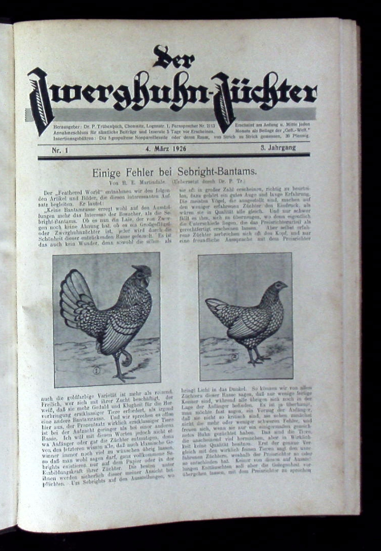 ORNITHOLOGIE.– TRÜBENBACH, P.: Der Zwerghuhn-Züchter. Erscheint Mitte jedes Monats als Beilage der Geflügel-Welt. 3. Jg. 12 Hefte in 1 Bd. Chemnitz (Trübenbach), 1926. 4°. 180 S. mit zahlr. Abb. HLn der Zeit. gutes Ex. seltene Zeitschrift.