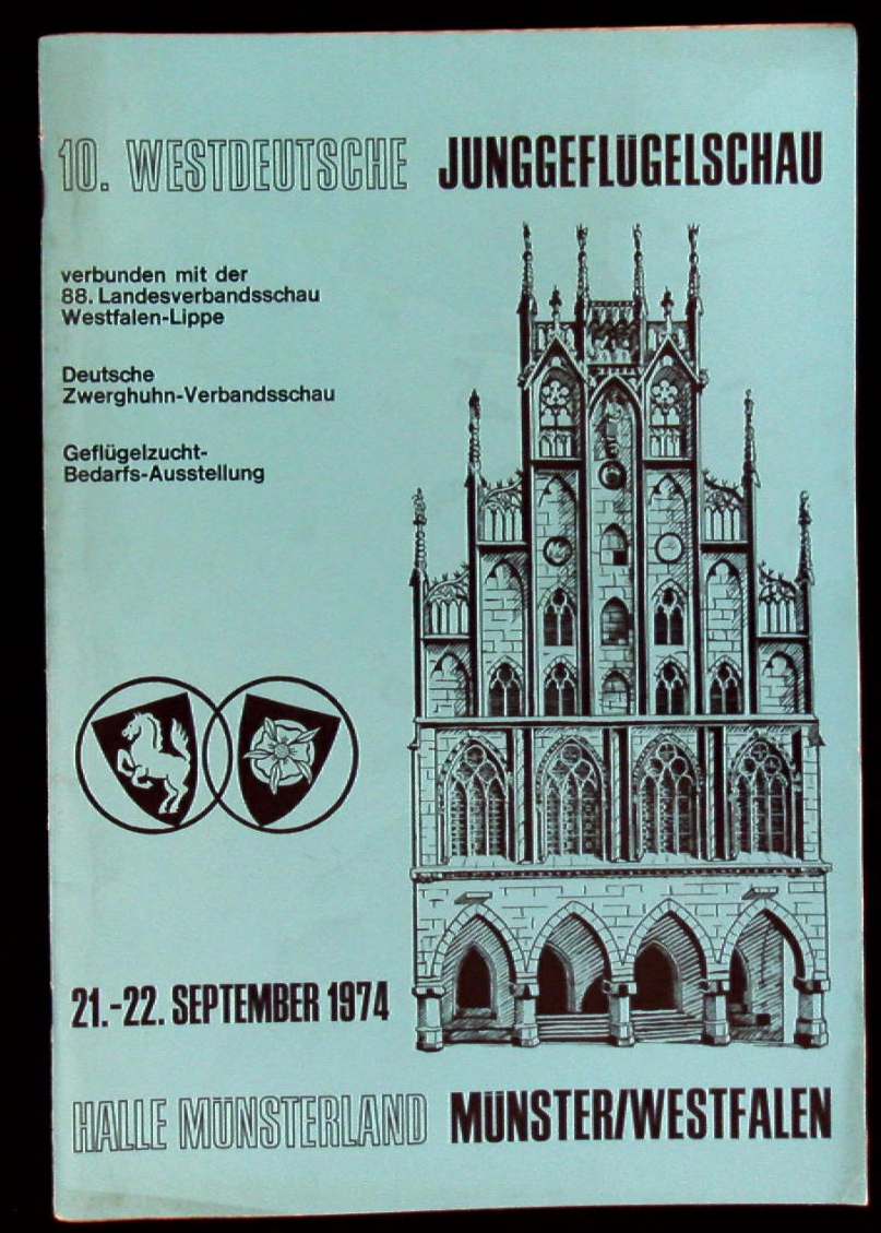 ORNITHOLOGIE.– BELZ, Ewald: (Leiter) 10. Westdeutsche Junggeflügelschau in Münster / Westfalen. 21.– 22. September 1974. Münster, 1974. 4°. XII, 48, 20 S. mit zahlr. Abb. ill. OKart. eine Seite eselsohrig, sonst gut.