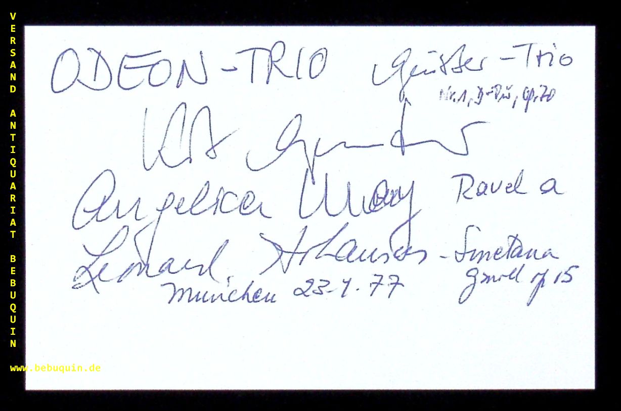 ODEON TRIO.– MAY, Angelica (Cellistin) + GUNTNER, Kurt (Violinist) + HOKANSON, Leonard (Pianist): eigenhändig von allen signierte und datierte Autogrammkarte. München (Herkulessaal), 8.4.1978. 8 x 12,5 cm. Karteinkarte. Autogramme von Angelica May (17.9.1933 – 7.1.2018) sind von großer Seltenheit. Angelica May war eine der renommiertesten deutschen Cellistinnen der Nachkriegszeit. Sie hatte das Glück, noch beim großen Pablo Casals studieren zu können. Angelica May gehörte zu den wenigen deutschen Cellistinnen, die sich nach dem Zweiten Weltkrieg einen internationalen Ruf erspielen konnten.