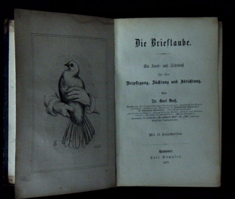 TAUBEN.– RUSS, Karl: Die Brieftaube. Ein Hand- und Lehrbuch für ihre Verpflegung, Züchtung und Abrichtung. Hannover (Rümpler), 1877. kl. 8°. XVI, 470 S. mit 12 Holzschnitten. HLdr der Zeit mit goldgeprägtem Rücken. Rücken stabilisiert, Titelbild mit leichtem Wasserrand, insgesamt gut und fest erhalten. sehr seltene EA dieses Klassikers. Karl Friedrich Otto Ruß (* 14. Januar 1833 in Baldenburg; † 29. September 1899 in Berlin) war einer der prominentesten Fachbuchautoren im Bereich Vögel, besonders der Vogelhaltung des 19. Jahrhunderts. (Wikipedia)