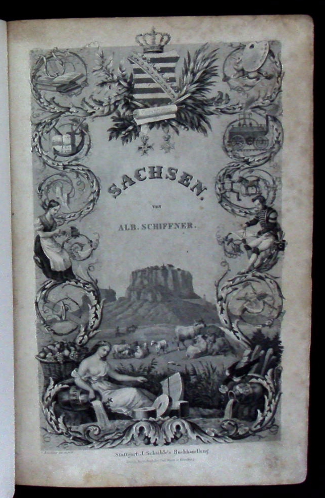 SACHSEN.– SCHIFFNER, Albert: Beschreibung von Sachsen und der Ernestinischen, Reußischen und Schwarzburgischen Lande. 2 Teile in 1 Bd. Stuttgart (Scheible), 1840. 22 x 15,5 cm. 1 Blatt, Seiten 8-800, IV, 27 Seiten; 60 Seiten (Nachträge) mit gestochenem Frontispiz, 192 Ansichten auf 96 Stahlstich-Tafeln und 2 mehrfach gefalteten, lithographierten Karten. Moderner Halblederband. Ohne den typographischen Titel. Durchgängig unterschiedlich gebräunt und braunfleckig. Die beiden Faltkarten fachgerecht aufgezogen. EA dieser reich illustrierten sächsischen Landeskunde, herausgegeben von dem Geographen Albert Schiffner (1792-1873). – Hier mit den fast immer fehlenden Karten sowie am Schluss: “Nachträge und Ergänzungen […] 1844 niedergeschrieben”. – Die reizvollen Tafeln überwiegend mit Ansichten, aber auch mit Trachten- und Uniformdarstellungen.
