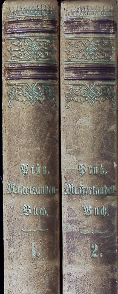 TAUBEN.– PRÜTZ, Gustav: (Hrsg.) Illustrirtes Mustertauben-Buch. Enthaltend das Gesammte der Taubenzucht. 2 Bände. Hamburg (Richter), (1886). 4°. XVII, 438 S. mit 81 Pracht – Farbendruck – Bildern von Christian Förster und 40 Original Text – Illustrationen und dreiseitigem Rotschnitt.. HLdr. der Zeit mit goldgeprägtem Rücken. Kanten etwas berieben, Rücken geblichen, NaT, insgesamt gutes Ex. EA. Niessen, 746/Möbes, S. 126 schreibt: Im Format (21 cm x 27 cm) das größte Taubenbuch, welches je veröffentlicht wurde. Mit einem hervorragenden Beitrag über die Huhntauben von Freiherr von Washington auf Schloß Porls in der Steiermark. Der Tiermaler Christian Förster hat die Bilder für dieses Prachtwerk geschaffen und sich damit als einer der befähigsten Künstler auf diesem Gebiet gezeigt, der in dem der Natur abgesehenen Leben, das aus seinen Taubengemälden strahlt, m.E. zeitweilig den berühmten Geflügelmaler Ludlow übertraf. Eine absolute Rarität.