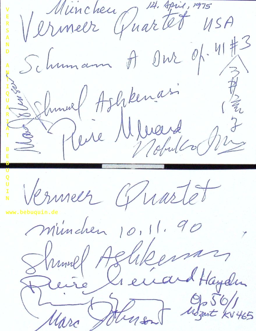 VERMEER-QUARTETT.– ASHKENASI, Shmuel + MENARD, Pierre + NOBUKO, Imai + JOHNSON, Marc: 2 eigenhändig von allen signierte und datierte Autogrammkarten. München, 1975 + 1990. 8 x 12,5 cm. 2 Karteikarten. The Vermeer Quartet was a string quartet founded in 1969 at the Marlboro Music Festival in Vermont and active until 2007. (Wikipedia)