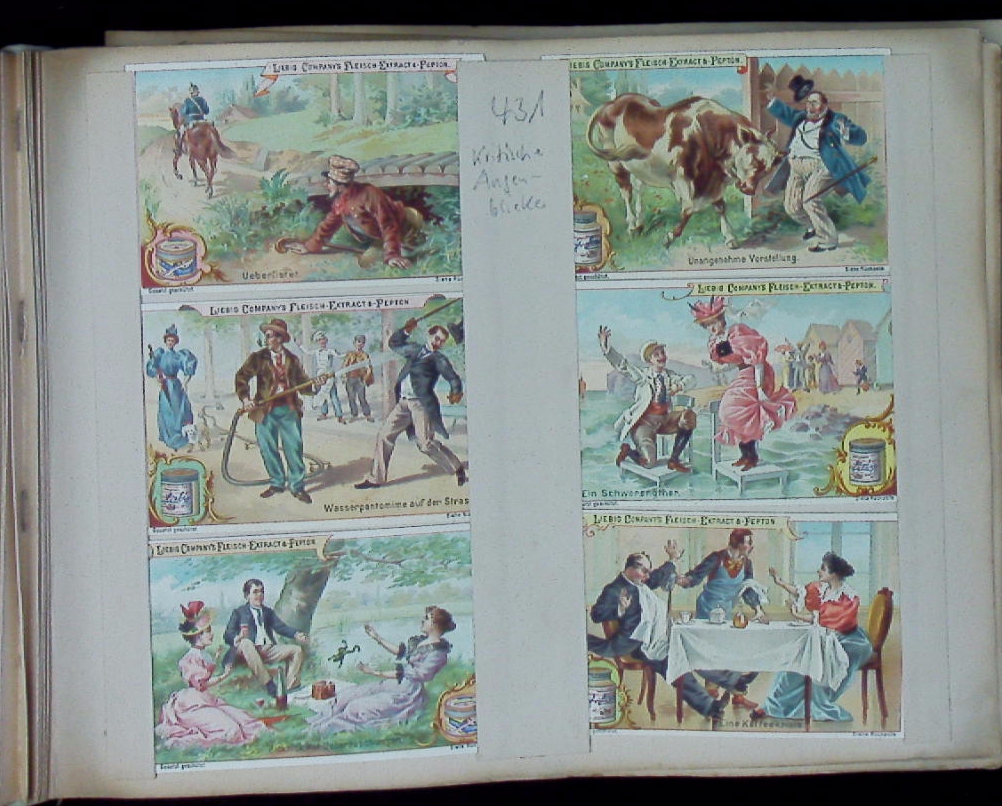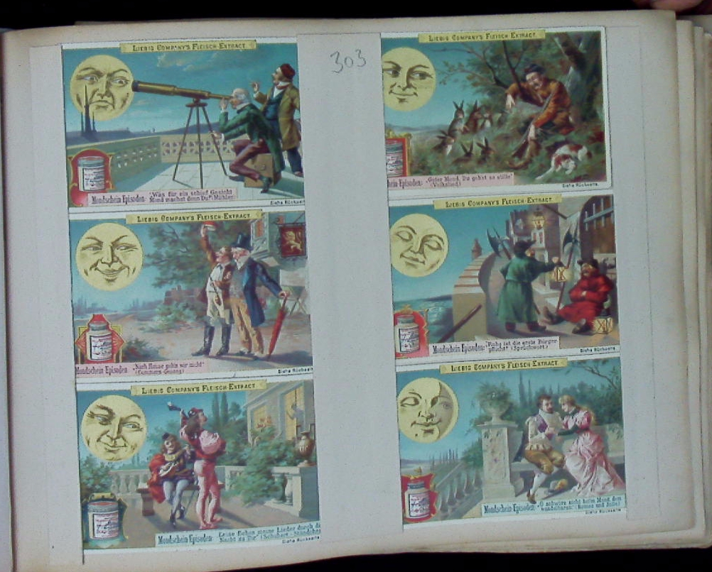 SAMMELBILDERALBEN.– LIEBIG.– Album mit Sammelbildern. Hamburg, (Liebig Company’s Fleisch-Extract), ca 1890 – 1920. Quer 4°. 68 Serien mit über 400 farb. Sammelbildern. Original Leinenalbum mit relativ seltener farbiger Einbandgestaltung mit Blume und Schmetterling. Album in ordentlicher Außenerhaltung, innen mit Streifenfixierung leicht wellig. Die Bilder überwiegend von guter Erhaltung mit einigen Beigaben. Folgende Serien sind vorhanden: 256, 341 (22,–), 247 (35,–), 317, 292 (25,–), 735, 244 (20,–), 304, 332, 260 (60,–), 270, 250, 313, 343, 342, 314 (45,–), 287, 315, 382 (25,–), 307 (1), 267 (20,–), 349, 328, 180 (40,–), 246, 461, 275 (20,–), 214 (4,5,6), 245 (1,3,4), 311, 398, 380, 302 (85,–), 319, 296, 327, 303, 277, 431, 232 (30,–), 345, 383 (20,–), 251 (25,–), 415, 280 (45,–), 190 (3), 369 (2), 184 (20,–), 249, 325, 295, 274 (25,–), 417, 286, 385, 194 (40,–), 201 (40,–), 334 (25,–), 282, 252 (22,–), 374, 362, 241 (25,–), 321, 276 (30,–), 254 (30,–), 348, 569, 728, 701, 731 (22,–) (In Klammern sind die jeweils fehlenden Bilder aufgeführt bzw. die Preise laut Liste).
