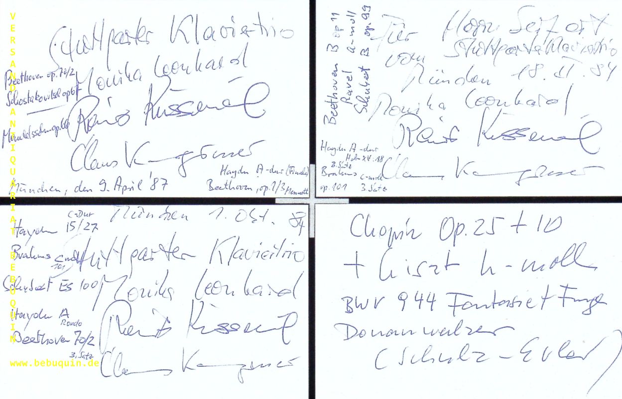 STUTTGARTER KLAVIERTRIO.– KUSSMAUL, Rainer (Violinist) + LEONHARD, Monika (Pianistin) + KANNGIESSER, Claus (Celist): 3 eigenhändig von allen 3 signierte und datierte Autogrammkarten. München (Herkulessaal), 1984. 8 x 12,5 cm. 3 Karteikarten. Rainer Kussmaul (* 3. Juni 1946 in Mannheim; † 27. März 2017 in Freiburg im Breisgau) war ein deutscher Violinist und Dirigent. (Wikipedia)