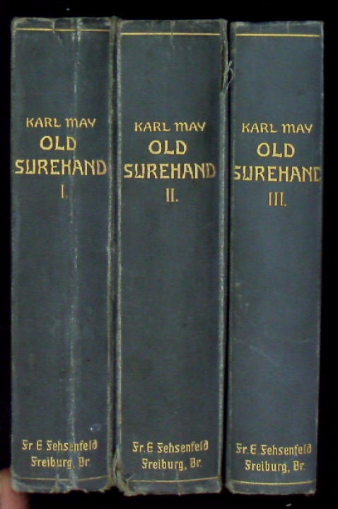 MAY, Karl: Old Surehand Reiseererlebnisse in 3 Bänden. 31.– 35. Tsd. 3 Bände. Freiburg (Fehsenfeld), (1904 / 1905). 644, 647, 566 S. mit den goldenen Vorsätzen. ill. OLn. von Sascha Schneider. (DB 67). Deckel teils etwas berieben, Kapitale teils bestoßen, Rücken von Bd. 1 mit Mittelfalz, Bd. 2 an den Kanten etwas angeplatzt, insgesamt durchaus gutes Ex. mit feiner Innenerhaltung. = Gesammelte Reiseerzählungen, Bd. XIV, XV, XIX. Plaul 261.6; 269.6; 286.5
