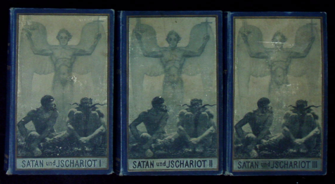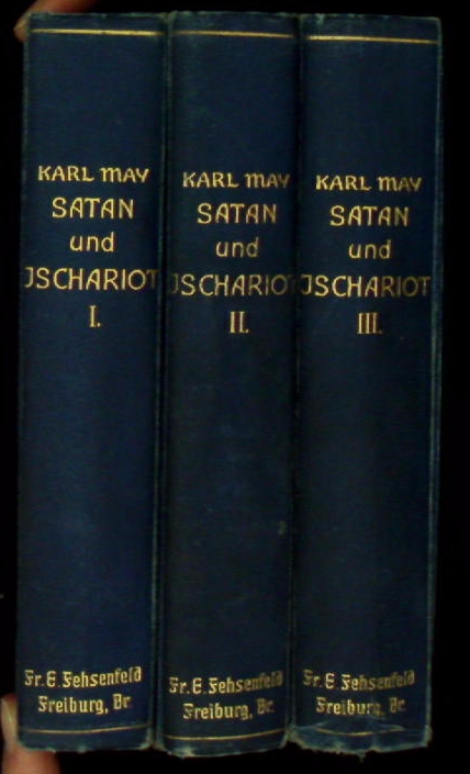 MAY, Karl: Satan und Ischariot. Reiseerlebnisse. 26.– 30. Tsd. 3 Bände. Freiburg (Fehsenfeld), 1905 / 1906. 550 (1), 540, 615 (1) S. mit den goldenen Vorsätzen. ill. blaue OLn von Sascha Schneider. (DB 73). die Deckel mitunter gering berieben, minimal schief gelesen, Ecken teils etwas bestoßen, sonst tadellos und von vorzüglicher Innenerhaltung. = Gesammelte Reiseerzählungen, Bd. XX – XXII. Plaul 287.5 + 291.5 + 292.5.