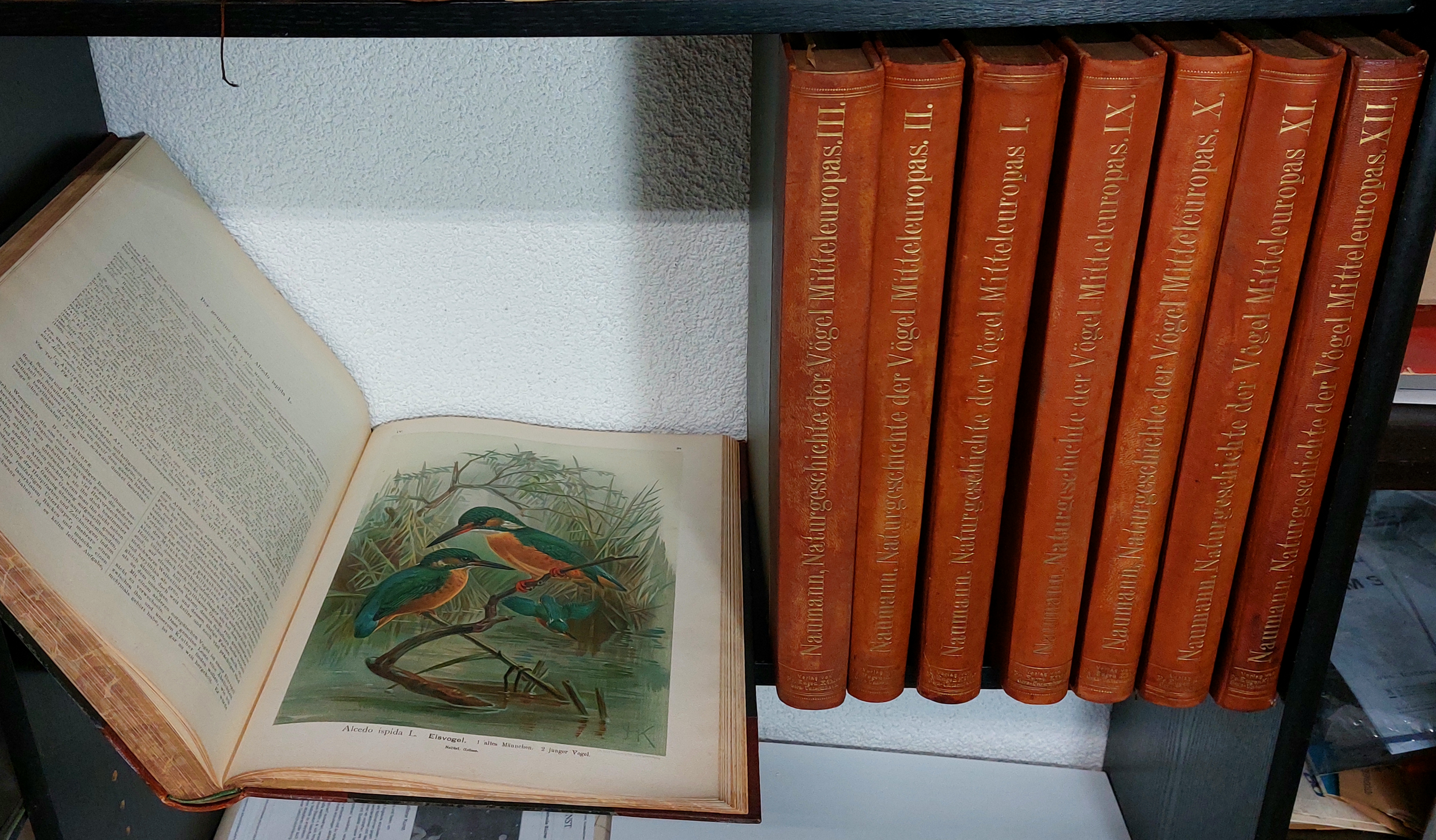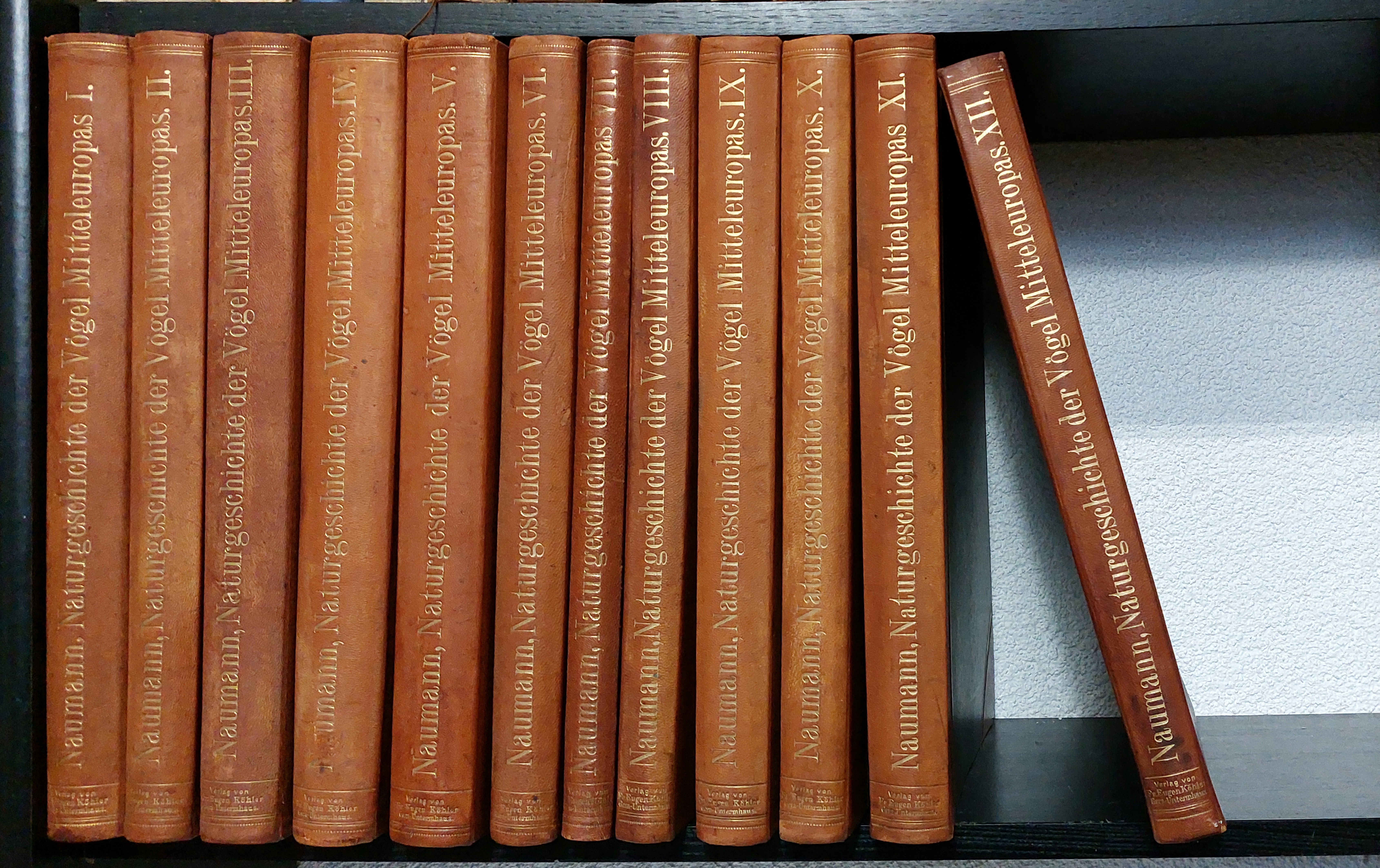 ORNITHOLOGIE.– NAUMANN, Johann Andreas: Naturgeschichte der Vögel Mitteleuropas. Neu bearbeitet v. G. Berg u.a. Hrsg. v. C.R.Hennicke. Vollständiges Exemplar der neuen (= dritten) Ausgabe. 12 Bände. Gera-Untermhaus (Köhler) 1897 – 1905. ca 5000 S. mit 449 (davon 439 farb.) lithogr. Bildtafeln: Bd. 1: Drosseln; Bd. 2: Grasmücken, Timalien, Meisen und Baumläufer; Bd. 3: Lerchen, Stelzen, Waldsänger, Finkenvögel; Bd. 4: Stärlinge, Stare, Pirole usw.; Bd. 5: Raubvögel; Bd. 6: Taubenvögel, Hühnervögel; Bd. 7: Ibisse, Flughühner, Trappen, Rallen usw.; Bd. 8: Regenpfeifer usw.; Bd. 9: Wasserläufer, Schnepfen; Bd. 10: Enten; Bd. 11: Pelikane usw.; Bd. 12: Sturmvögel usw. OHLdr mit goldgeprägten Rücken. Kanten wenig berieben, es fehlen einige Seidenhemdchen, insgesamt jedoch von sehr guter Erhaltung. Dritte und letzte Ausgabe des berühmtes Werkes über die Vogelwelt Mitteleuropas mit prachtvollen und leuchtenden Tafeln. Die für diese dritte Auflage neu gezeichneten Tafeln stammen von B. Geisler, A. Goering, O. Kleinschmidt, J. G. Keulemans, O. von Riesenthal u. a. (Nissen, IVB 667. Anker 356. Horstkötter 92)