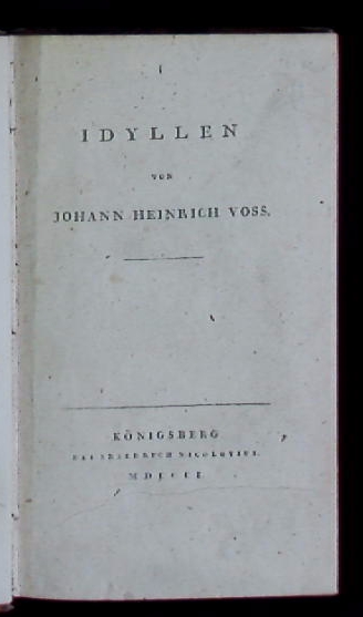 VOSS, Johann Heinrich: Idyllen. Königsberg (Nicolovius), 1801. 8°. 386 (1) S. Pb der Zeit mit goldgeprägtem Rückenschild. feines Ex. EA WG² 24 mit falscher Seitenangabe.