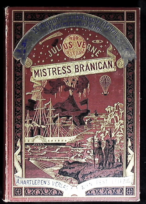 VERNE, Julius: Mistress Branican. 2 Teile in 1 Bd. Wien (Hartleben), 1893. Gr. 8°. 354 S. mit 83 Textabb., 1 Bl. OLn. mit reicher Gold- und Schwarzprägung sowie Farbschnitt. Kanten etwas berieben, Vorsatz mit Kleberesten, sonst gut. = Bekannte und unbekannte Welten, Bd. 59 + 60. Prachtausgabe. dt. EA. Fromm 26376.