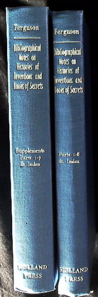 FERGUSON, John: Bibliographical notes on histories of inventions and books of secrets. 2 Bände. London (Holland), 1959. ca 400 S. OLn. Vorsätze mit Kleberesten, sonst gut. 1 von 350 Ex. dieser Ausgabe der EA der gesammelten Vorträge Fergusons. Ein Kompendium zur Geschichte der Bibliographie naturwissenschaftlicher und alchimistischer Werke des 16.– 19. Jahrhunderts.